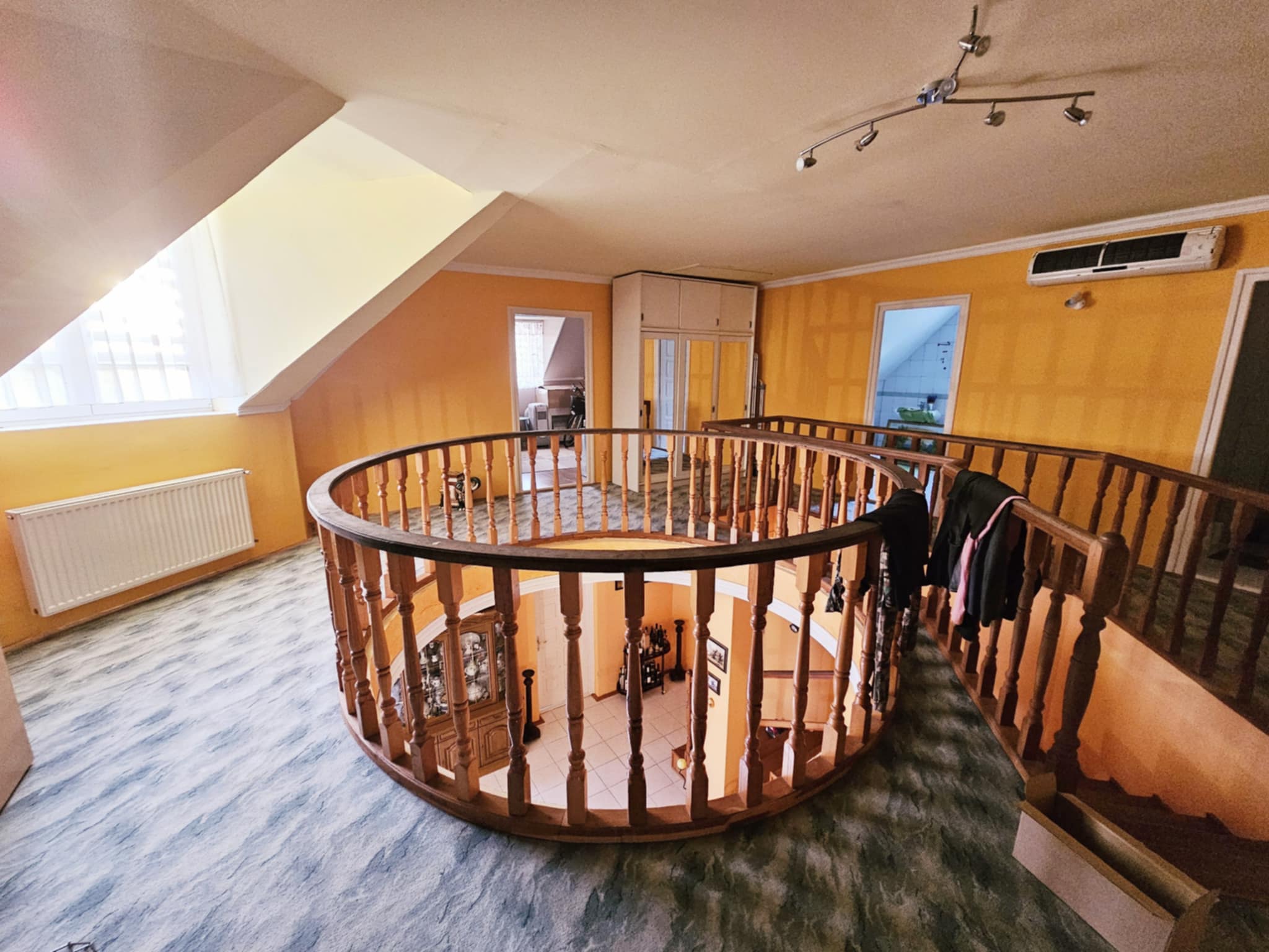 • A legnagyobb, 30 m²-es emeleti szoba akár 2 külön szobára is bontható → így akár 5 hálószobás ház is kialakítható! - Galériás előtér hűtő-fűtő klímával